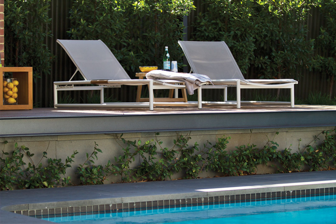 Bold, mass, low-maintenance planting schemes were used, including citrus trees, French lavender, star jasmine, rosemary and thyme. As with all Tim Davies Landscaping projects, water-wise subsurface irrigation was used in all of the planted areas. Stake lights, deck lights and bollards combine to create an ambient atmosphere, while furnishings from Eco Outdoor ensure the retreat is a comfortable place to relax.